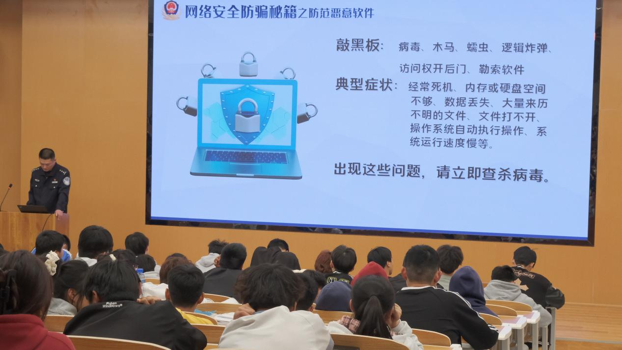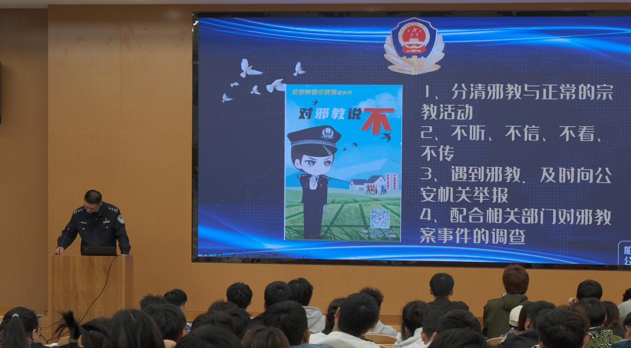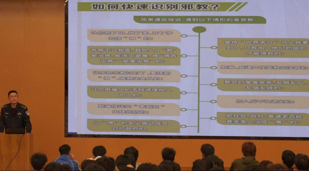 讲座伊始,民警通过多媒体展示,以图文结合的形式向在场同学介绍了邪教的本质、特征、危害以及防范和抵制邪教的方式方法。随后,民警为同学们播放邪教案例视频,以真实案例为引,进一步加强同学们的辨别能力以及防范意识。
