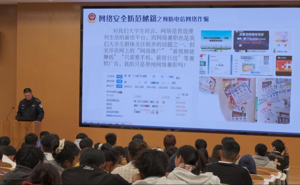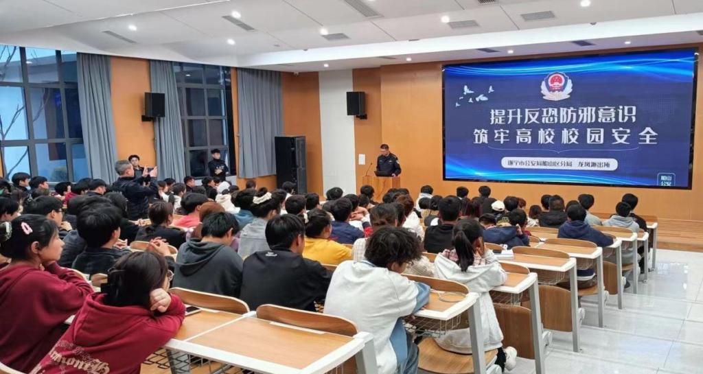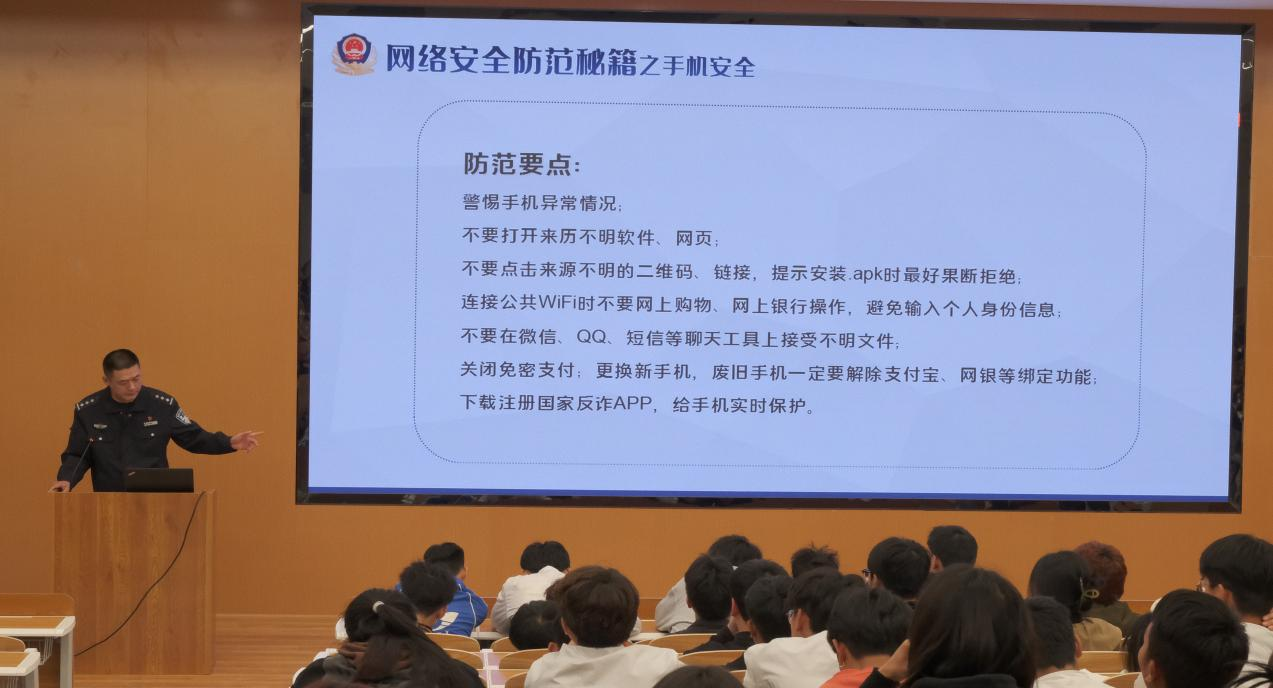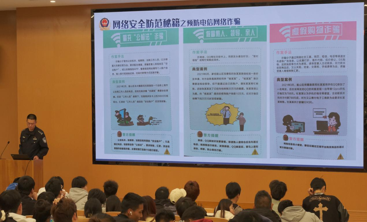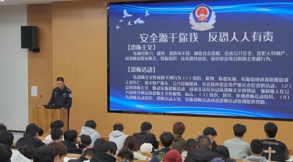 为加强同学们的防骗,防邪意识,筑牢高校校园安全。2024年3月27日,食品与生物技术学院组织各班同学在龙凤校区B5-101开展了“提升反恐防邪意识,筑牢高校校园安全”知识讲座。本次活动邀请了遂宁市公安局船山区分局龙凤派出所的民警为大家讲解。