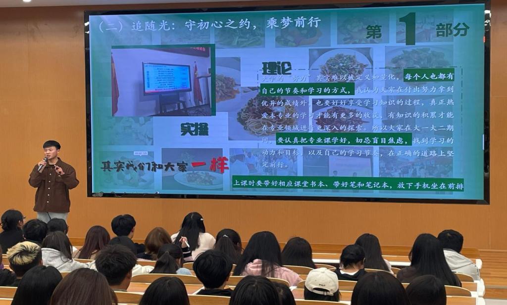 然后由国家奖学金获得者伍文斌发表自己的认识和理解,激励同学们在青春的路上要学会励志以及如何向目标前进,在学业上我们该如何完成自己的目标,以及给自己立下更高的志向。他向我们分享了西交大校长王树国向青年学子说的话,让我们在梦想的旅途中坚定自我,为青春的奋斗无怨无悔。他也以自身举例,讲述自己是如何在青春路上不负韶华,如何毅然前行,他慷慨激昂的语气激励了在场的各位同学。
