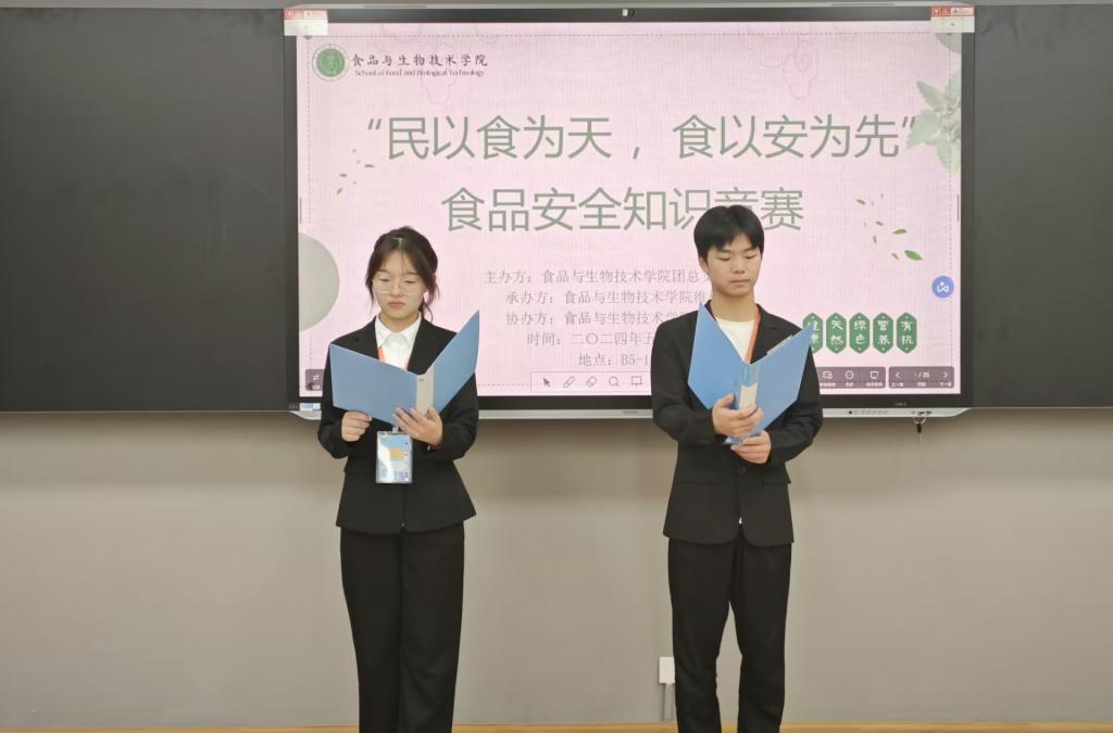为增强同学们的食品安全意识,普及食品安全科学知识。5月30日,由食品与生物技术学院团总支学生会举办的“民以食为天,食以安为先”食品安全知识竞赛在B5-501成功举办。参加此次活动的有团总支学生会指导老师潘富春和杨晓仪老师,团总支学生会主席团以及参赛同学。