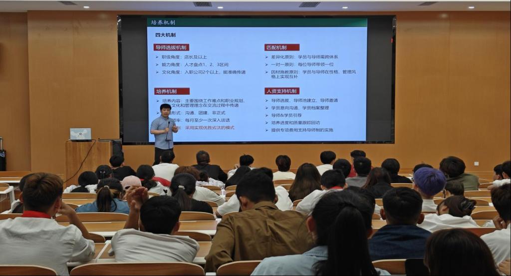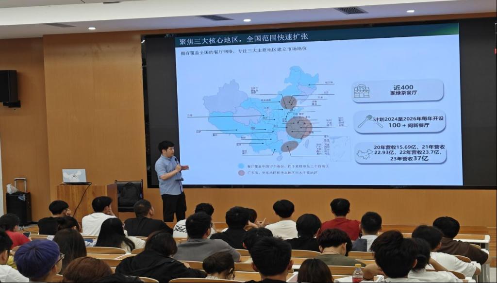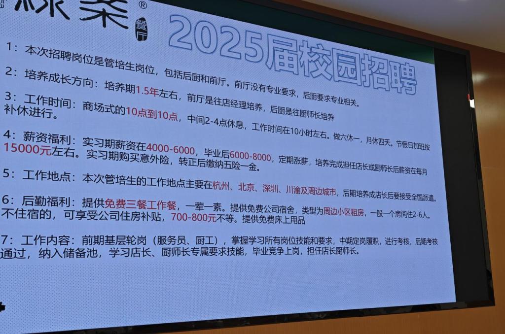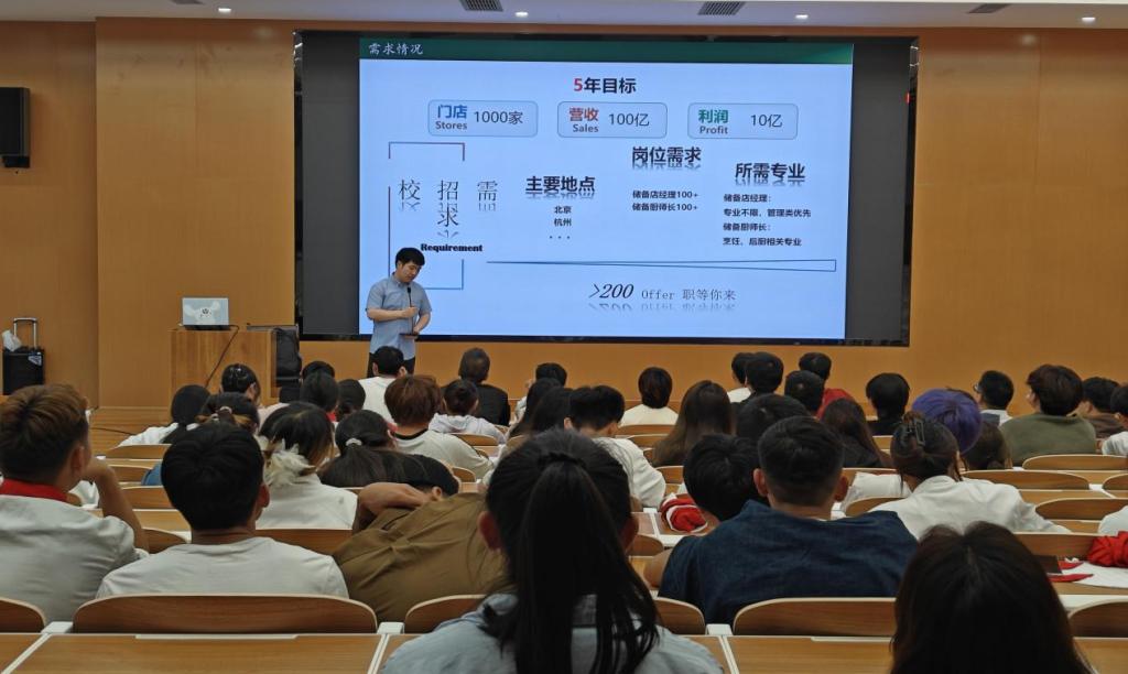 公司负责人为同学们详细介绍了公司的概况、发展历程、企业文化以及招聘的岗位和要求。绿茶餐饮集团一直致力提供高品质的餐饮体验,重视员工的培养和发展。