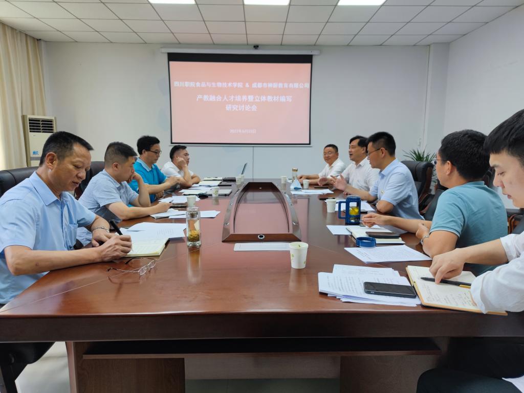 6月23日,食品与生物技术学院组织召开了产教融合人才培养方案暨立体教材编写研讨会。本次会议是在四川职业技术学院与成都市神厨教育有限公司签订实质性合作协议的基础上,为进一步推进产教深度融合召开的。学校副校长李勇,党委委员、副校长王创,成都市神厨教育有限公司施维乐、徐小明、谢君宪等十位公司领导、技能大师及职教专家参加了本次研讨会。会议由食品与生物技术学院副院长江华明主持。
