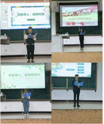 为持续深入贯彻落实全国全省高校思想政治工作会议和全国全省教育大会精神,积极宣传党和国家的学生资助政策与成效,进一步加强学生社会主义核心价值观教育,倡导诚实守信的道德风尚,推动我校学生资助工作持续健康高质量发展。2023年3月18日晚上19:40在尚学楼D101教室,四川职业技术学院食品生物与技术学院举办了以“资助育人,诚信校园行”为主题的演讲比赛。