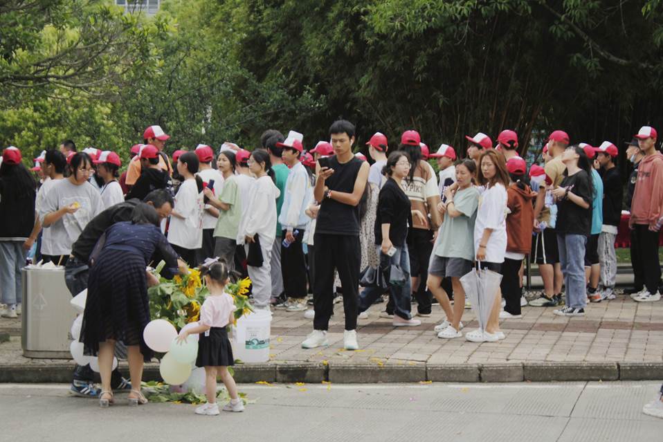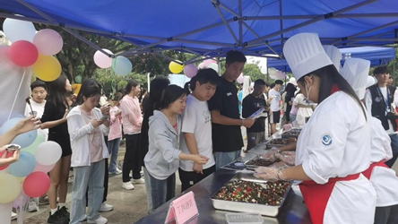 在烹饪实训中心所在的行知路本次美食节现场设立了展示区、品尝区和体验区,摊位丰富,各色美食热气腾腾。这里一改平日里的宁静,变成了人声喧嚣,热闹异常的“餐饮一条街”。