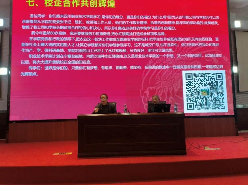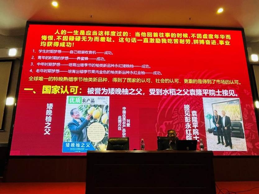 大国农匠彭永红他结合自身成长经历,回顾了矮晚柚种植的艰辛奋进历程:执着心中小小的梦想,经过45年的辛酸和泪水终于获得成功,为国家培育出全球唯一的特晚熟错季节柚类新品种——永红矮晚柚。“坚持梦想,刻苦钻研,有多大的担当,就能干多大的事业,尽多大的责任就能有多大的成就。”他将身上甘于奉献的劳模精神、精益求精的工匠精神、敢于突破的担当精神生动诠释给在场师生。同学们纷纷表示,要以大国农匠彭永红为榜样,脚踏实地,锤炼技能,实现自己的“工匠梦”。
