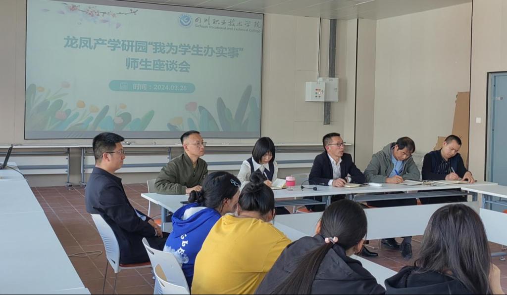 为进一步了解新校区师生心声,解决师生急难愁盼事宜,3月28日下午,四川职业技术学院龙凤产学研区在烹饪实训楼317会议室开展“我为师生办实事”座谈会,学校党委委员、副校长刘光彬出席会议,龙凤产学研园区管委会、学工部、基建后勤餐饮服务中心、教务处相关同志及食品与生物技术学院部分学生代表参加会议。会议由食品与生物技术学院党支部书记尹黎主持。