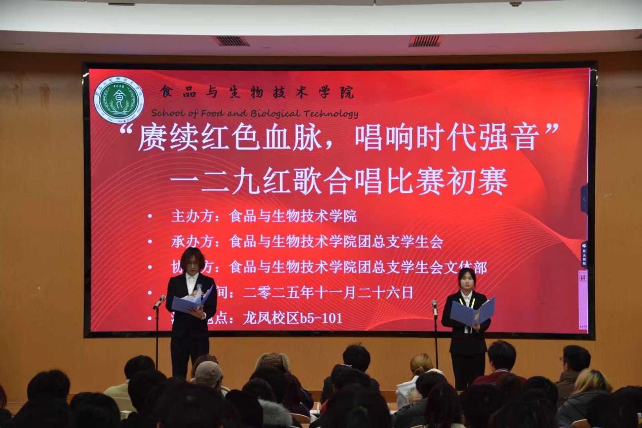 为了传承红色基因、弘扬革命精神,丰富文化生活。11月26日食品与生物技术学院团总支学生会文体部在B5-101开展以“赓续红色血脉,唱响时代强音”为主题的一二九红歌歌唱比赛初赛。