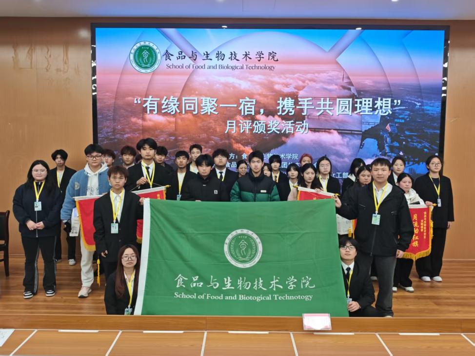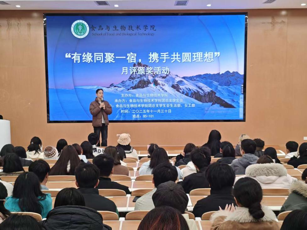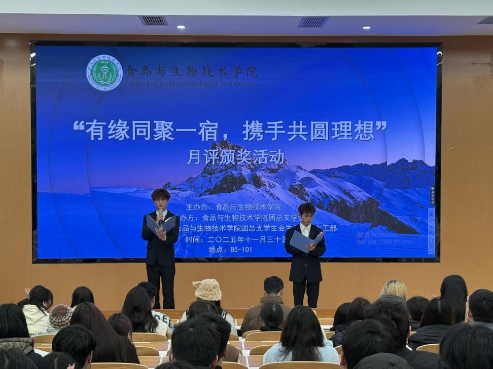 从方寸天地见文明,于细节之处显风采。11月30日,由食品与生物技术学院团总支学生会生活部、女工部举办的“有缘同聚一宿,携手共圆理想”月评颁奖活动在B5-101开展。出席此次活动的有学生会指导老师潘富春、林雍及学生会各部门负责人。