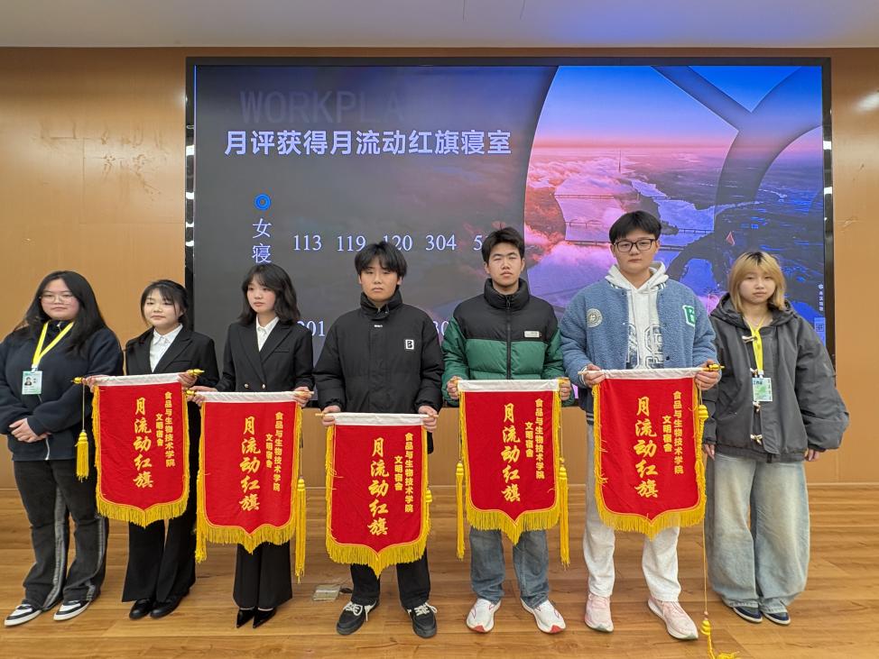 11月文明寝室获评名单在活动现场正式公布,工作人员为优秀宿舍送上流动红旗与奖品,以此激励同学们强化卫生自律意识,共同打造宜居舒心的宿舍环境。