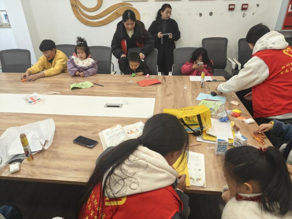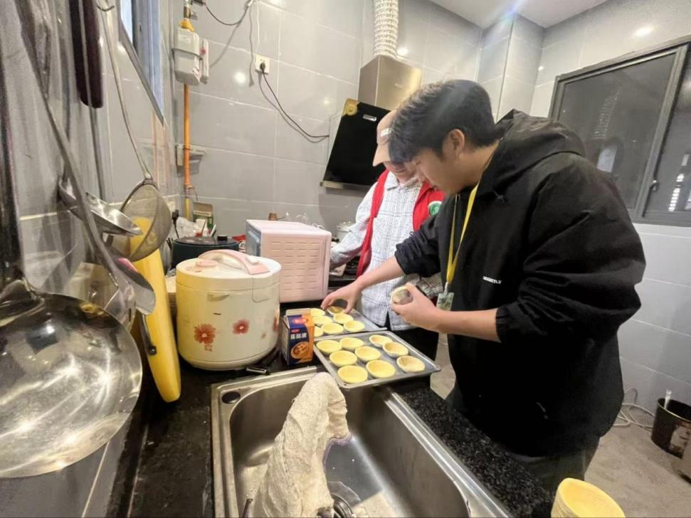 志愿者与孩子们围坐一堂,或捏彩泥,或绘图画,童声笑语不断;又默契配合制作蛋挞,从调配蛋液到烘烤上色,每一步都细致专注。金黄酥香的蛋挞承载着对老人的敬意,也让温暖在指尖和味蕾间同时升腾。