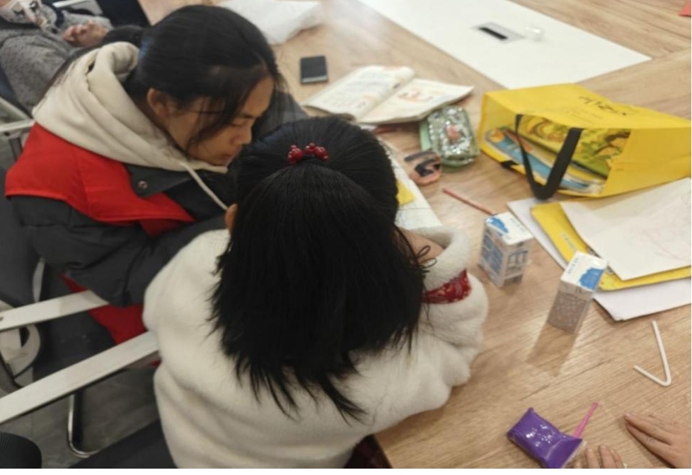 现场备有黏土、卡纸及纸箱、瓶盖、布料等废旧材料,志愿者化身“小老师”,手把手教孩子把纸箱剪成卡通、用瓶盖拼图案、以黏土布料做立体作品,创意频出,笑声不断。社区提前布置场地、组织人员,学院团队全程跟进,用专业和热情为孩子们搭起“变废为宝”的展示舞台。