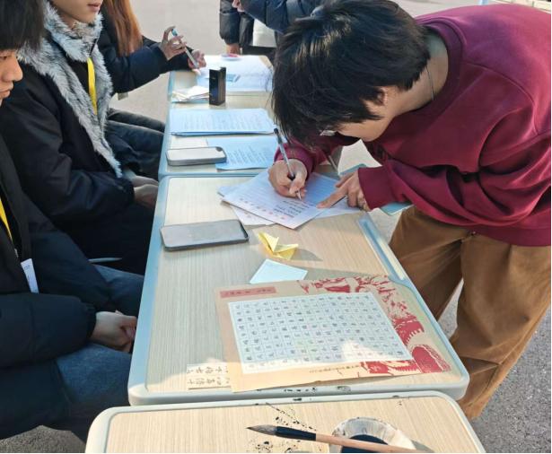 活动现场,长桌上宣纸、毛笔、墨碟排列整齐,墨香氤氲。同学们凝神聚气,提笔落纸,笔锋转折间尽显青春意气,吸引来往同学驻足参与,让传统书法在现代校园里焕发崭新魅力。