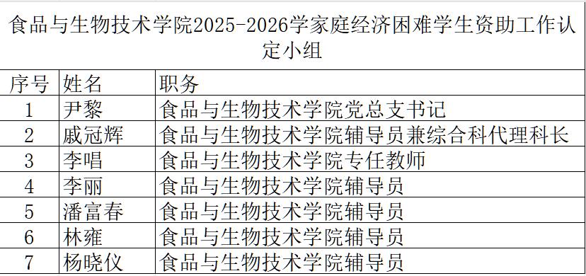根据《关于认真做好2025—2026学年家庭经济困难学生认定工作的通知》、《四川职业技术学院家庭经济困难学生认定办法》(川职院学字[2024]77号)等文件要求,秉承公平、公正、公开的原则,食品与生物技术学院组建2025-2026学年家庭经济困难学生资助工作认定小组,成员名单如下。